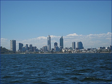 Hazy view of Perth, returning by boat from a long, sweltering day out