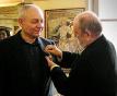 CAMERATA HIGHLIGHTS OF 2005 It was a busy year with some of the most intense touring of recent seasons; a creative year as a beautiful, brand-new Camerata recording appeared on the marketplace; as well as a year of celebration and thanksgiving as we fêted our fiftieth anniversary with friends in Paris and Boston. February Off for an extensive winter tour of "New Britain", west and south of Boston. Among the highlights, a reunion in Nashville with Hazel and Murray Somerville, Hazel's boy choir chiming in with us at the local concert. April The month begins with a marvelous 50th anniversary celebration in Paris, including a sold-out standing ovation performance of "Nueva España" at the Théatre de la Ville and then, backstage a lively post-concert party in Sarah Bernhardt's former dressing room. The womens' choir of Les Amis de la Sagesse joined us for both events, and Joel received a French government medal pinned on his chest at the second one. We see again many French and European supporters and encouragers of our music over the years, and feel surrounded by love and friendship. Thanks, Suzanne! We spend much of the remainder of April in Europe, touring the "Borrowed Light" production with Tero Saarinen's Finnish dance company. The crowds in England and Sweden love the Shaker music and the dancing; and we love the Italian food and architecture; even thought the folks in that country were a little perplexed by the show. May Back to Europe for two performances with Tero's company in, of all places, the Volkswagen industrial complex at Wolfsburg, Germany. We go for walks around the nearby medieval castle to escape the creepy 1930's ambiance; audiences and journalists rate the performances a great success. June Another anniversary bash, this time at the Boston Early Music Festival. To celebrate our 50 th, Camerata performs “Carmina Burana” at Jordan Hall, and at concert’s end the Camerata’s Board chairman Sandi Bagley wheels in a big birthday cake! Former Camerata musicians and music directors join us onstage. Joel is especially touched by the presence of his student-days mentor Victor Mattfeld. Post-concert hall, a reception reunites American musicians, friends, and supporters from across the years (see photo below). Our cup runneth over, and we pour the excess into new plans and projects for the coming half-century.